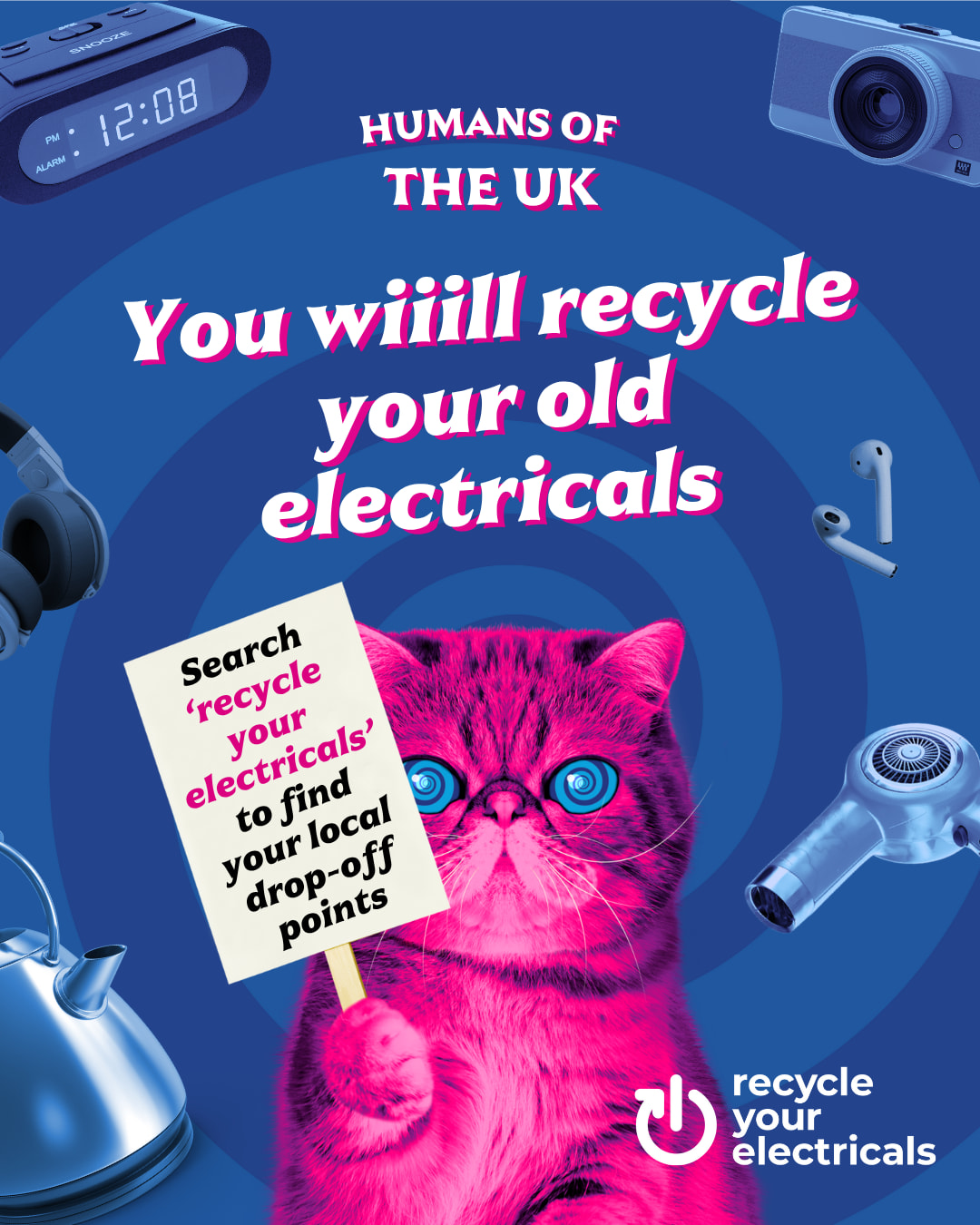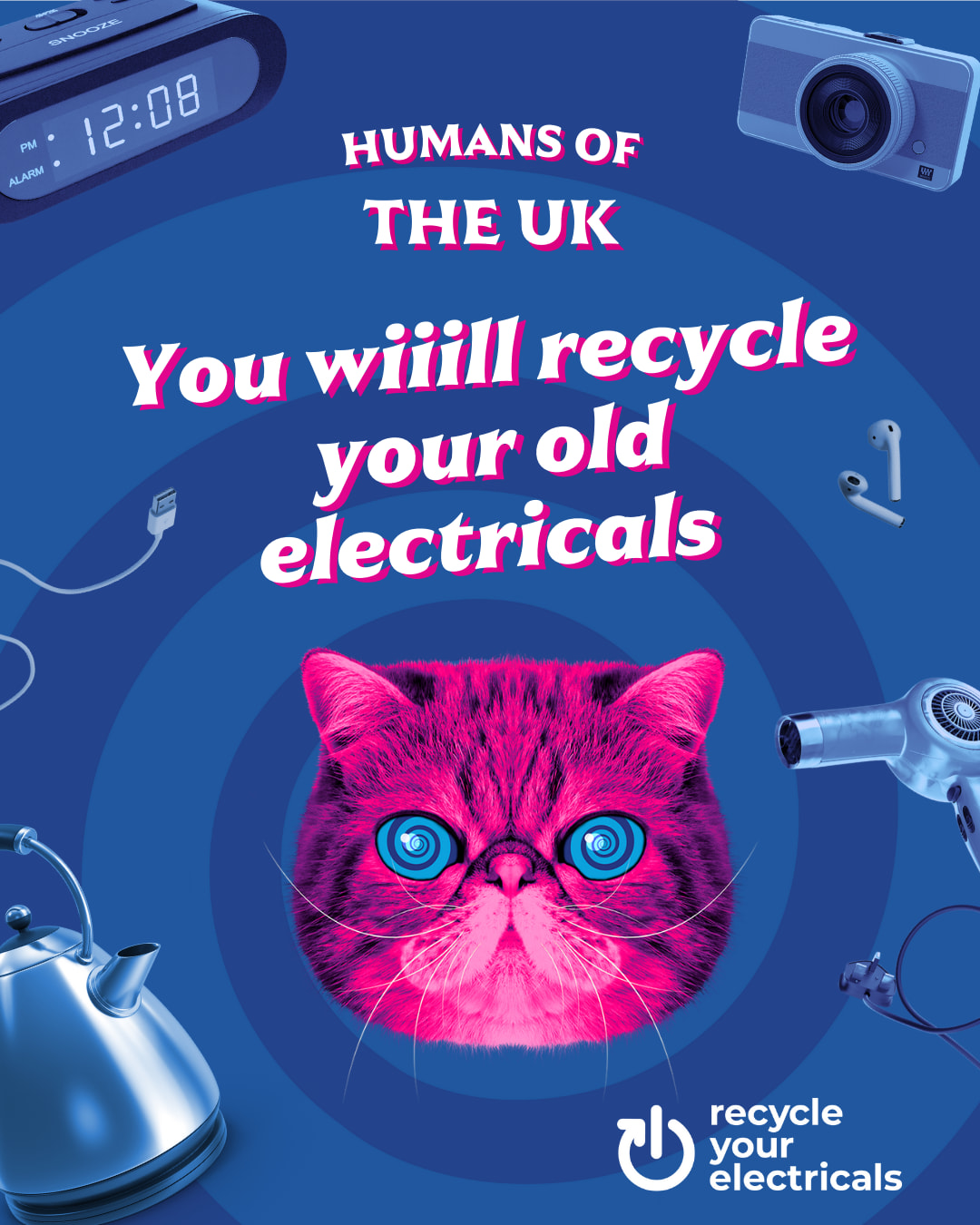 Hypno Cat is here to help us all recycle our electricals properly… Watch the video below and download a poster and put them up around your community, upload them onto your social networks or just send it to a friend… encourage everyone to take a look in their own “drawer of doom” and uncover cables, old phones and more… Hypno cat will point you in the direction of where to recycle them. See the video fro more info…